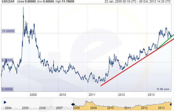 Creo que a los metales y monedas commodities les espera una bajada en el corto plazoTengo el rollover en mi contra pero espero que la bajada sea rápida.Compra USD/ZARStop: cierre bajo linea verdeTarget: ???... lo que el mercado nos dé. Postearé mi salida si no me toca el stop antes.