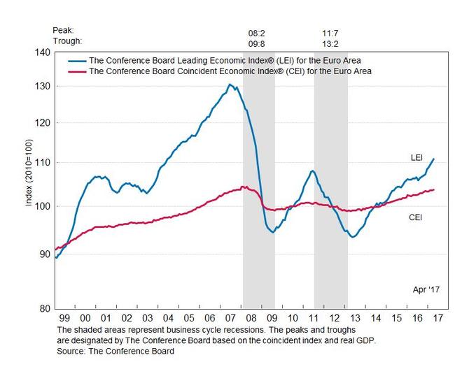 Eurozona: indicador líder 110,9 puntos en abril El indicador adelantado a la evolución de la economía del conjunto de la eurozona calculado por The Conference Board, repuntó fuertemente en abril un 0,7% hasta los 110,9... 1 de junio, 2017