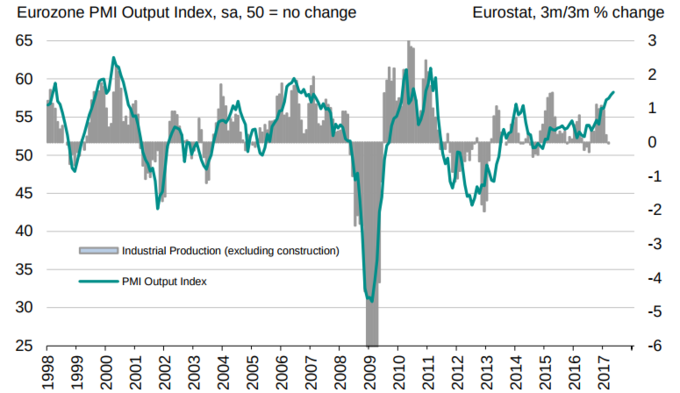 Eurozona: Flash PMI Manufacturero 57 en mayo Según el dato adelantado de Markit, la actividad industrial en la zona euro se ha acelerado en el último mes, pasando de 56,7 en abril a 57 en mayo. Se trata del registro... 23 de mayo, 2017