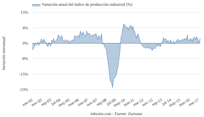 Eurozona: Índice de producción industrial +2,28% interanual en marzo Según Eurostat, el índice de producción industrial para la zona euro alcanzó en febrero el nivel de 105,8, un nivel ligeramente inferior al dato del mes anterior... 12 de mayo, 2017