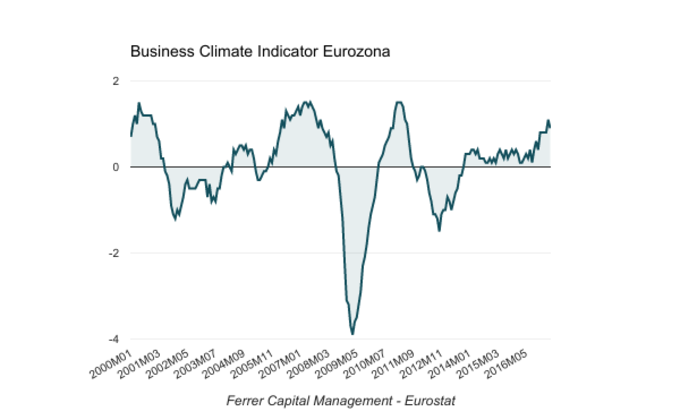 Eurozona: Clima Empresarial 0,9 en mayo El índice de clima empresarial en el conjunto de la Eurozona (EA19) declinó este mes de mayo hasta los 0,9 puntos. No obstante es una de las mayores lectura del actual... 30 de mayo, 2017
