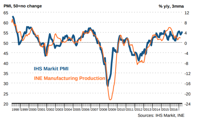España: PMI manufacturero 55,4 en mayo El índice de difusión PMI manufacturero, que trata de reflejar la evolución del sector industrial de la economía registró 55,4 puntos en el mes de mayo, 0,9 décimas... 1 de junio, 2017