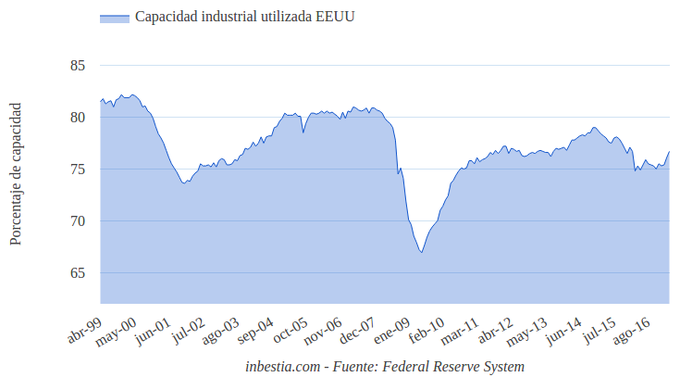 EEUU: Capacidad industrial utilizada 76,7% en abril Según la Reserva Federal, el porcentaje de capacidad industrial utilizada en abril fue del 76,7%, significativamente por encima del mes anterior y más de un punto... 16 de mayo, 2017