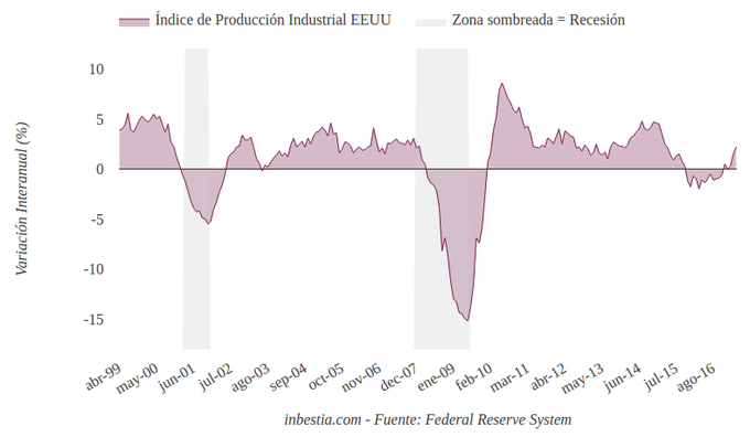 EEUU: Índice de Producción Industrial +2,2% interanual en abril El índice de producción industrial en EEUU creció un 1% en abril con respecto al mes anterior, acumulando una aumento del 2,2% en los últimos 12 meses. Parece que la... 16 de mayo, 2017