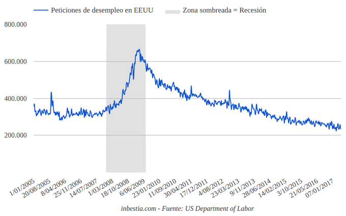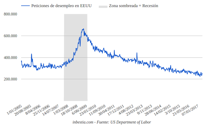 El número de nuevas solicitudes de subvenciones por desempleo, declinaron la pasada semana hasta las 238.000, una de las lecturas más bajas del actual ciclo expansivo de...