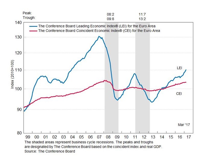El indicador adelantado a la evolución de la economía del conjunto de la eurozona calculado por The Conference Board, repuntó fuertemente en marzo siete décimas hasta...