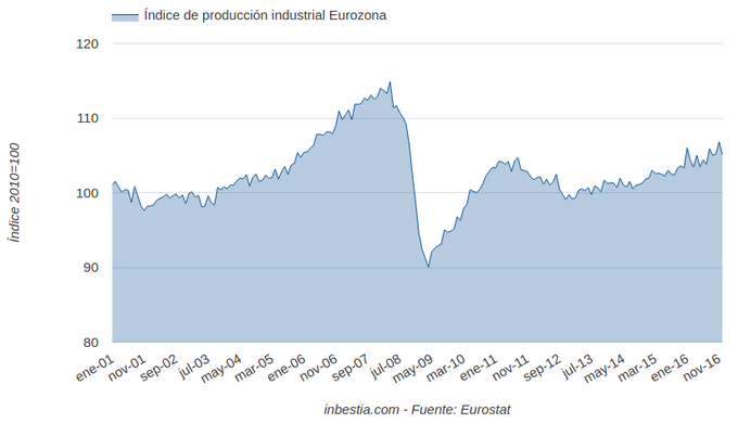 Eurozona: Índice de producción industrial +1,74% interanual en diciembre Según Eurostat, el índice de producción industrial para la zona euro alcanzó en diciembre el nivel de 105,1, un nivel inferior al dato del mes anterior de 106,8. Hay que... 14 de febrero, 2017