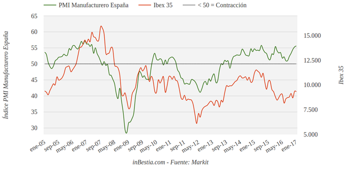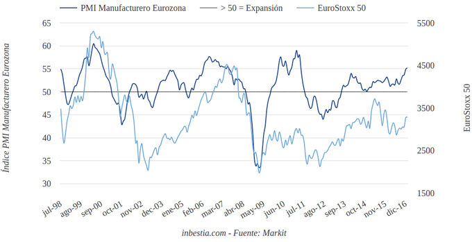 Eurozona: PMI Manufacturero 55,2 en enero El indicador de actividad industrial elaborado por Markit Economics para la zona euro ha revisado al alza el dato adelantado de enero en el nivel de 55,2, cuatro décimas... 1 de febrero, 2017