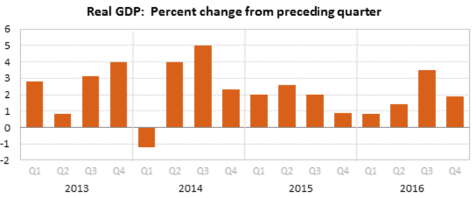 EEUU: Producto Interior Bruto +1,9% en el cuarto trimestre de 2016 Según la agencia estadística Bureau of Economic Analysis, el Producto Interior Bruto de Estados Unidos creció un 1,9% en el cuarto trimestre de 2016, según los primeros... 27 de enero, 2017