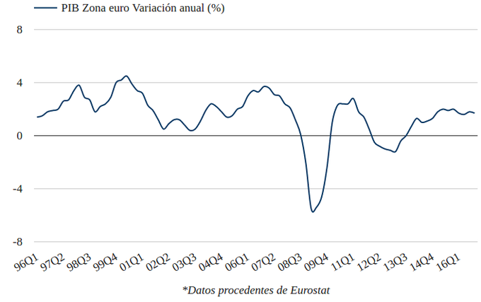 Eurozona: PIB +1,7% interanual en el cuarto trimestre de 2016 Según Eurostat, el Producto Interior Bruto de la zona euro creció un 0,4% en el cuarto trimestre con respecto al anterior. Al comparar con el mismo trimestre del año... 14 de febrero, 2017