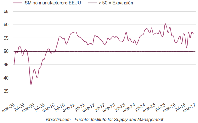 EEUU: Índice ISM no manufacturero 56,5 en enero El índice elaborado por Institute for Supply Management (ISM) para el sector no manufacturero alcanzó en enero el nivel de 56,5, una décima inferior al dato del mes... 3 de febrero, 2017