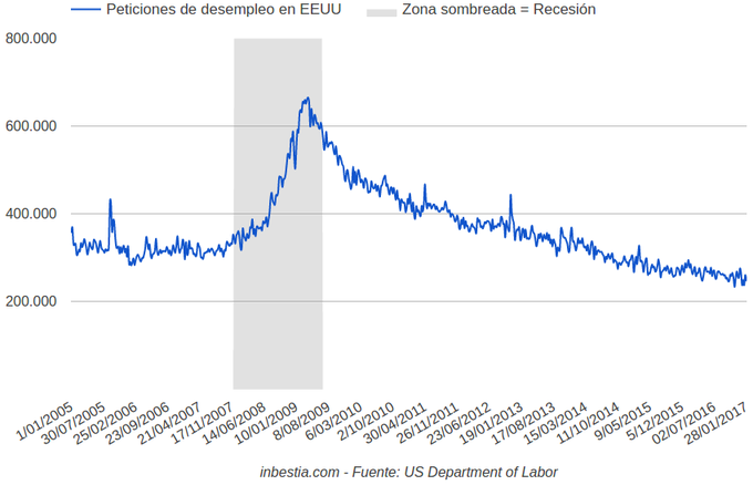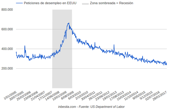 EEUU: Peticiones de paro 234.000 Durante la pasada semana se solicitaron 234.000 nuevos seguros de desempleo en los Estados Unidos, una cifra inferior a la de la semana anterior de 246.000. En los últimos... 9 de febrero, 2017