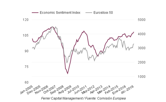 Eurozona: Índice Sentimiento Económico 108,2 en Enero El índice de sentimiento económico de la Eurozona ascendió en este mes de enero hasta los 108,2 puntos. Se trata de la lectura más elevada del actual ciclo expansivo de... 30 de enero, 2017