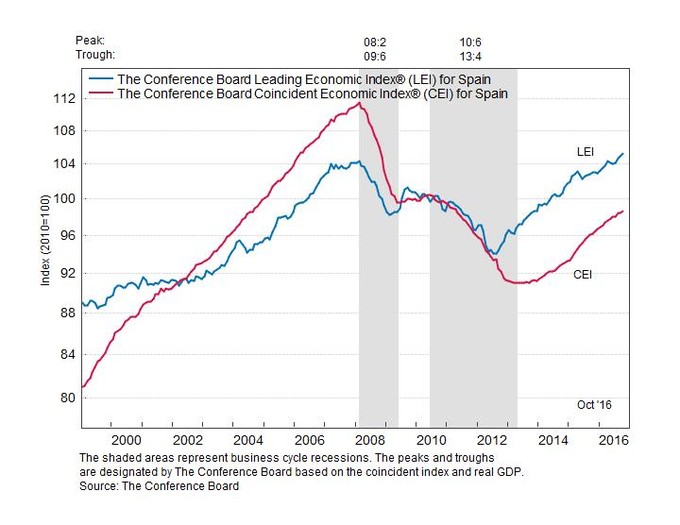 España: indicador líder +0,4% en octubre El indicador líder o adelantado a la economía española calculado por The Conference Board, repuntó el pasado mes de octubre cuatro décimas porcentuales hasta los 105,3... 12 de diciembre, 2016