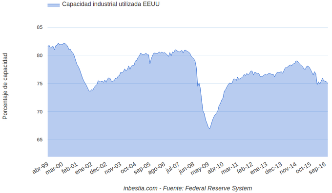 EEUU: Capacidad industrial utilizada 75% en noviembre Según la Reserva Federal, el porcentaje de capacidad industrial utilizada en noviembre fue del 75%, tres décimas porcentuales por debajo del mes anterior y siete décimas... 14 de diciembre, 2016
