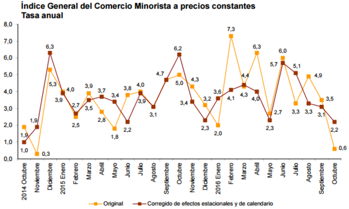 España: Índice de comercio al por menor +2,2% interanual en octubre Según los datos procedentes del Instituto Nacional de Estadística, el volumen del comercio al por menor en España creció un 2,2% interanual en octubre en términos... 30 de noviembre, 2016