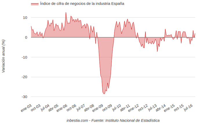 España: Cifra de negocios de la industria +2% interanual en octubre Según el Instituto Nacional de Estadística, el índice de cifra de negocios de la industria en España aumentó un 2,1% en octubre con respecto al mes anterior. Se trata... 21 de diciembre, 2016