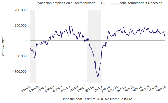 EEUU: +216.000 empleos en el sector privado en noviembre La economía norteamericana creó 216.000 empleos en el sector privado durante el mes de noviembre, según la entidad privada Automatic Data Processing. Este dato se... 30 de noviembre, 2016