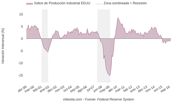EEUU: Índice de Producción Industrial -0,6% interanual en noviembre El índice de producción industrial en EEUU descendió un 0,4% en noviembre con respecto al mes anterior, acumulando una caída del 0,6% en los últimos 12 meses. Parece... 14 de diciembre, 2016