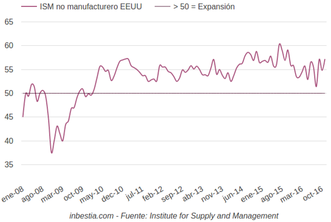 EEUU: Índice ISM no manufacturero 57,2 en noviembre El índice elaborado por Institute for Supply Management (ISM) para el sector no manufacturero alcanzó en noviembre el nivel de 57,2, muy por encima del dato del mes... 5 de diciembre, 2016