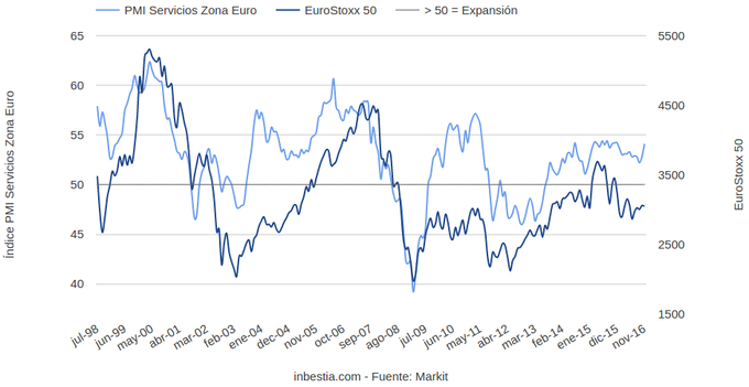 Eurozona: Flash PMI Servicios 54,1 en noviembre Según el dato adelantado de Markit, la actividad del sector servicios en la zona euro se desacelera ligeramente en el último mes, pasando de de 52,8 en octubre a 54,1 en... 23 de noviembre, 2016