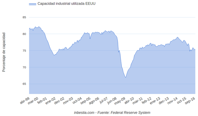 EEUU: Capacidad industrial utilizada 75,3% en octubre Según la Reserva Federal, el porcentaje de capacidad industrial utilizada en octubre fue del 75,3%, una décima porcentual por debajo del mes anterior y tres décimas... 16 de noviembre, 2016