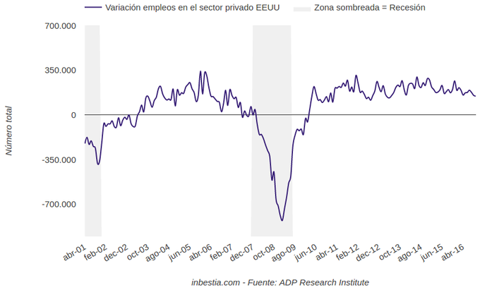 EEUU: +147.000 empleos en el sector privado en octubre La economía norteamericana creó 147.000 empleos en el sector privado durante el mes de octubre, según la entidad privada Automatic Data Processing. Este dato se encuentra... 2 de noviembre, 2016