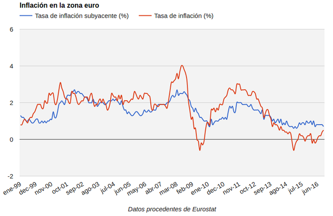 Eurozona: Tasa de inflación 0,5% en octubre Según Eurostat, el dato de inflación en la zona euro es del 0,5% en octubre, una décima superior al dato del mes anterior. La tasa de inflación confirma la entrada en... 17 de noviembre, 2016