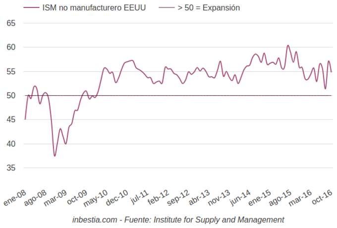 EEUU: Índice ISM no manufacturero 55,4 en octubre El índice elaborado por Institute for Supply Management (ISM) para el sector no manufacturero alcanzó en octubre el nivel de 55,4, por debajo del mes anterior de 57,1 pero... 3 de noviembre, 2016