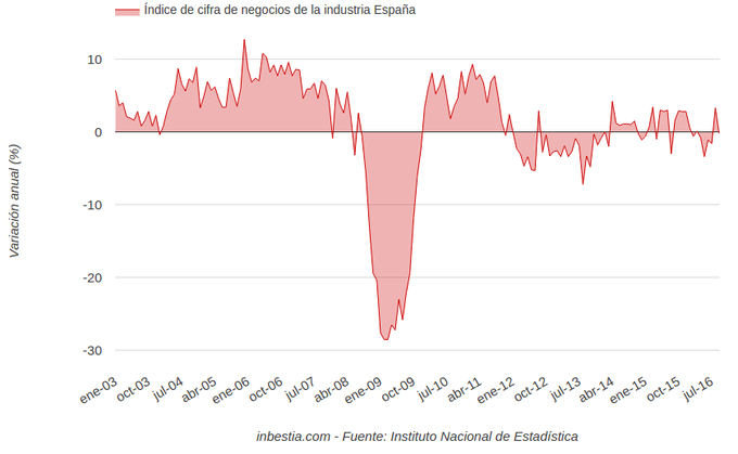 España: Cifra de negocios de la industria -0,2% interanual en septiembre Según el Instituto Nacional de Estadística, el índice de cifra de negocios de la industria en España descendió un 1,1% en septiembre con respecto al mes anterior. Se... 23 de noviembre, 2016