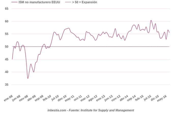EEUU: Índice ISM no manufacturero 55,5 en julio El índice elaborado por Institute for Supply Management (ISM) para el sector no manufacturero alcanzó en julio el nivel de 55,5, por debajo del mes anterior de 56,5.... 3 de agosto, 2016