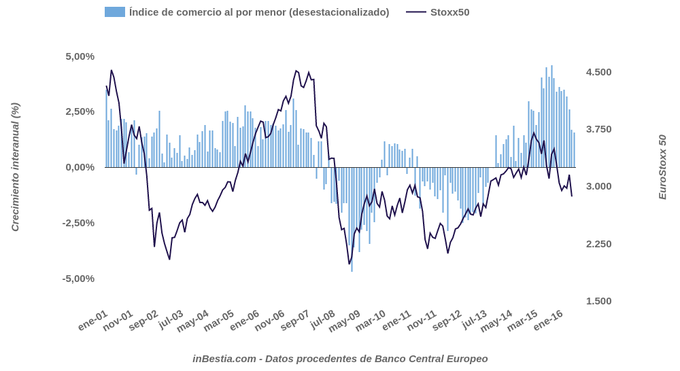 Eurozona: Índice de comercio al por menor +1,57% interanual en junio Según los datos procedentes del Banco Central Europeo, el volumen del comercio al por menor creció un 1,57% interanual en junio en la zona euro. En los últimos meses el... 3 de agosto, 2016