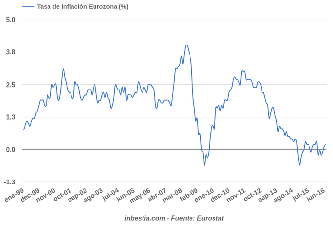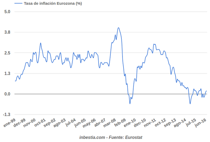 Eurozona: Tasa de inflación 0,2% en julio Según Eurostat, el dato de inflación en la zona euro es del 0,2% en julio, una décima por encima del dato del mes anterior. La inflación entra en terreno positivo... 18 de agosto, 2016