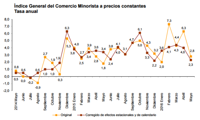 España: Índice de comercio al por menor +2,3% interanual en mayo Según los datos procedentes del Instituto Nacional de Estadística, el volumen del comercio al por menor en España creció un 2,3% interanual en mayo en términos... 28 de junio, 2016