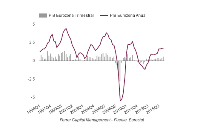 Eurozona: PIB trimestre 1º 2016 +0,6% El producto interior bruto de la Eurozona, creció seis décimas en el primer trimestre de 2016, en lo que es la tasa de crecimiento trimestral más elevada desde principios... 7 de junio, 2016
