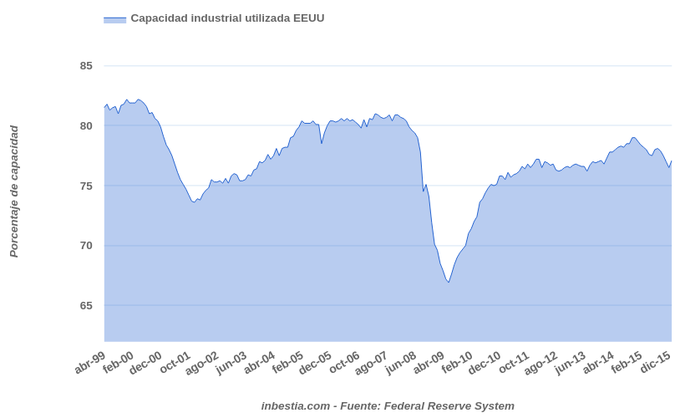 EEUU: Capacidad industrial utilizada 77,1% en enero Según la Reserva Federal, el porcentaje de capacidad industrial utilizada en enero fue del 77,1%, siete décimas mayor que en diciembre y 1,6 puntos porcentuales inferior... 17 de febrero, 2016