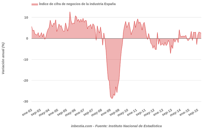 España: Cifra de negocios de la industria +2,6% interanual en diciembre Según el Instituto Nacional de Estadística, el índice de cifra de negocios de la industria en España bajó un 0,6% en diciembre con respecto al mes anterior. Se trata de... 19 de febrero, 2016
