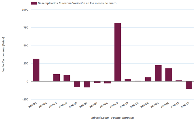 Eurozona: 105.000 parados menos en enero El número de desempleados en la Eurozona descendió el pasado mes de enero en 105.000 personas, hasta un total de 16,64 millones de personas. En el último año han salido... 1 de marzo, 2016