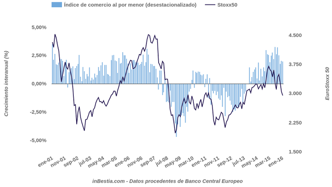 Eurozona: Índice de comercio al por menor +2% interanual en enero Según los datos procedentes de Eurostat, el volumen del comercio al por menor creció un 2% interanual en enero en la zona euro, mientras que el crecimiento para el... 3 de marzo, 2016
