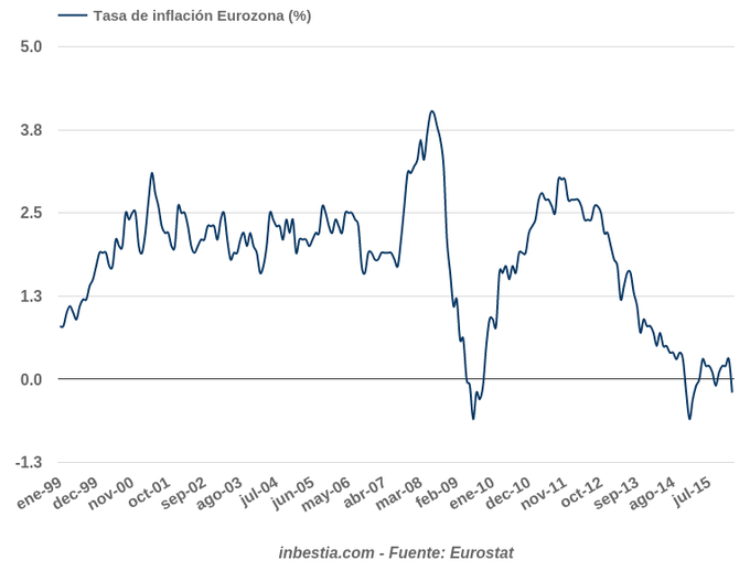 Eurozona: Dato adelantado de inflación -0,2% en febrero Según Eurostat, el dato adelantado de inflación en la zona euro es del -0,2%, cinco décimas inferior al de enero. Con este dato, la tasa de inflación vuelve a entrar en... 29 de febrero, 2016