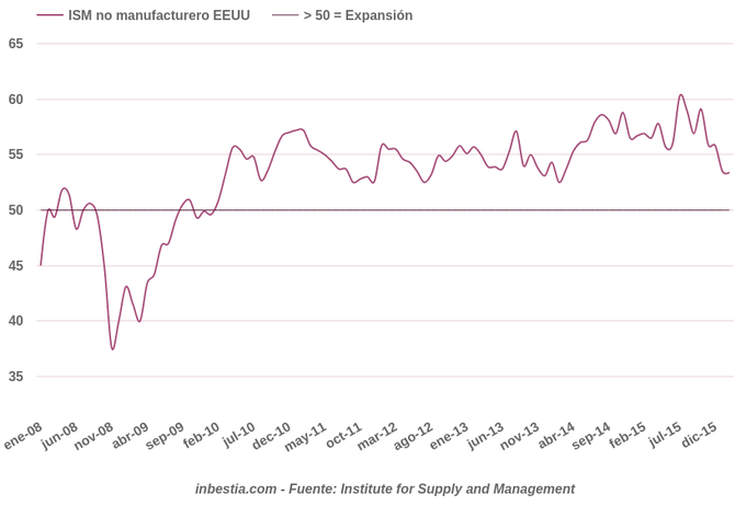 EEUU: Índice ISM no manufacturero 53,4 en febrero El índice elaborado por Institute for Supply Management (ISM) para el sector no manufacturero alcanzó en febrero el nivel de 53,4, una décima por debajo del dato del mes... 3 de marzo, 2016