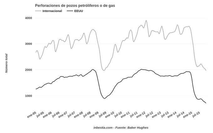 Internacional: Perforaciones de pozos -78 en diciembre Según Backer Hughes, el número de perforaciones de pozos de petróleo o gas siguió descendiendo tanto en Estados Unidos como en el mundo. El dato internacional registra... 15 de enero, 2016