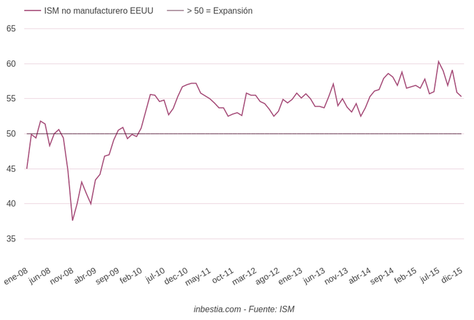 EEUU: Índice ISM no manufacturero 55,3 El índice elaborado por Institute for Supply Management (ISM) para el sector no manufacturero alcanzó en diciembre el nivel de 55,3, seis décimas menos que en... 6 de enero, 2016
