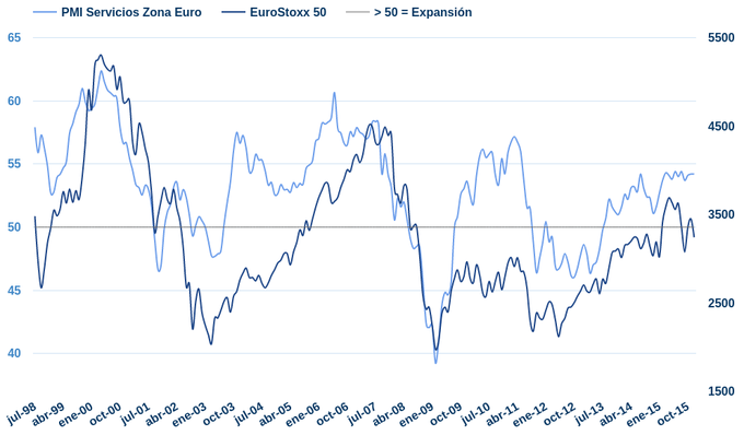 Eurozona: PMI Servicios en diciembre 54,2 El índice PMI Servicios elaborado por Markit alcanzó el nivel de 54,2 en diciembre para la zona Euro, tres décimas por encima de la estimación provisional elaborada hace... 6 de enero, 2016