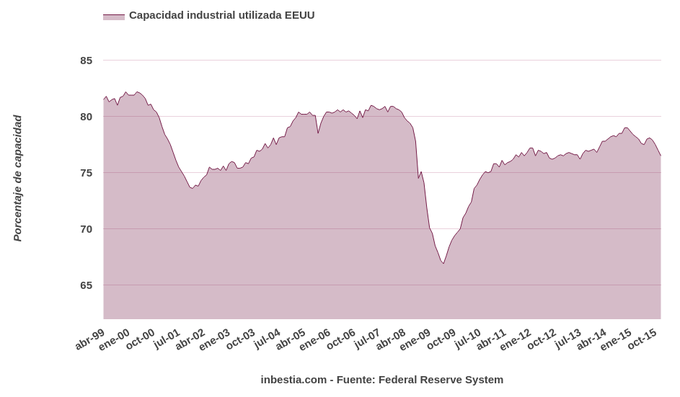 EEUU: Capacidad industrial utilizada 76,5% en diciembre Según la Reserva Federal, el porcentaje de capacidad industrial utilizada en diciembre fue del 76,5%, cuatro décimas menor que en noviembre y 2,5 puntos porcentuales... 15 de enero, 2016