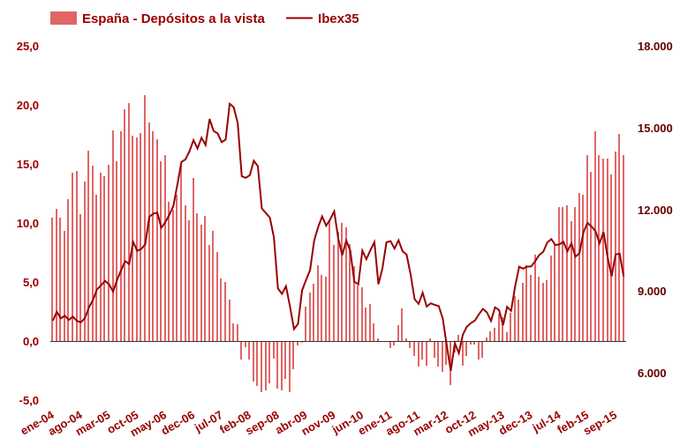 España: Depósitos a la vista +15,8% interanual Según el Banco Central Europeo, el agregado monetario de depósitos a la vista en España creció a una tasa interanual del 15,8% en noviembre, un nivel levemente inferior... 31 de diciembre, 2015