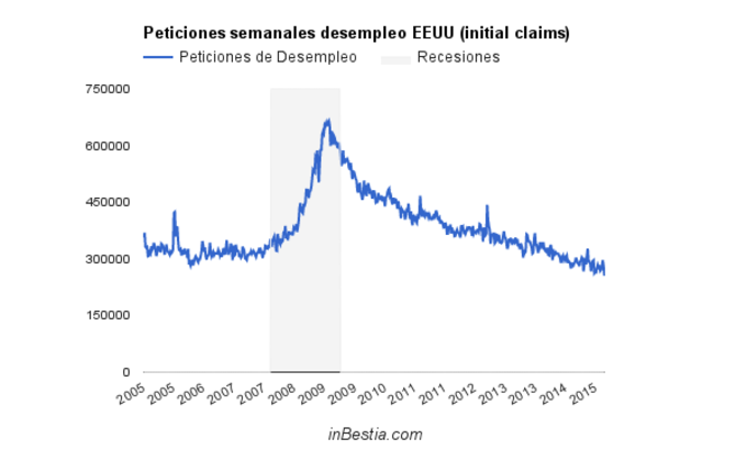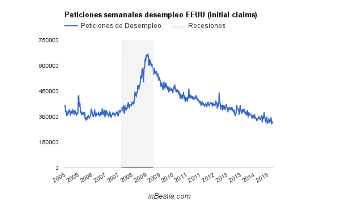 EEUU: Las peticiones de paro marcan nuevo mínimo cíclico Las nuevas solicitudes de los seguros de desempleo en los EEUU declinaron la pasada semana hasta las 255.000, la cifra más baja del actual ciclo expansivo de la economía... 23 de julio, 2015
