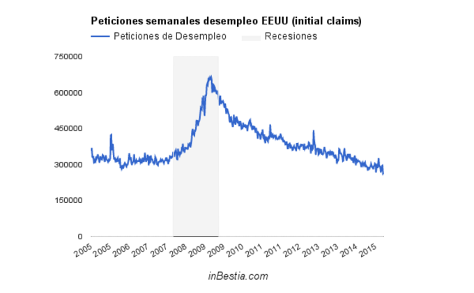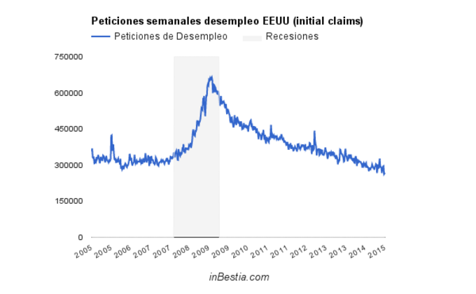 EEUU: Peticiones de Paro 265.000 Durante la pasada semana se solicitaron 265.000 peticiones de los seguros de desempleo en los Estados Unidos, una cifra similar a la de la pasada semana y cerca del mínimo... 7 de mayo, 2015