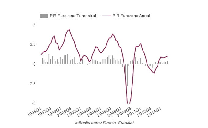 Eurozona: PIB +0,4% Trimestre 1 2015 El producto interior bruto de la Eurozona aumentó en cuatro décimas en el primer trimestre con respecto al último trimestre de 2014. En términos anuales el PIB crece al... 13 de mayo, 2015