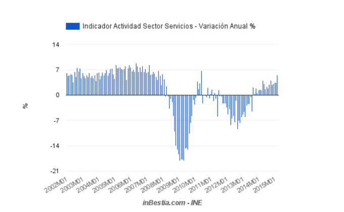 España: Sector Servicios +1,1% Marzo El sector servicios español creció en actividad un 1,1% en el mes de marzo con respecto a febrero. La evolución anual muestra un crecimiento del 5,6%, la cifra más... 21 de mayo, 2015